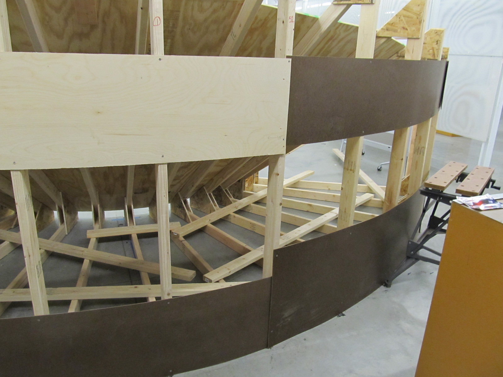 While most of the group has formed into teams cutting frame or track, some of us have set to work dealing with some of the many small technical problems that have been discovered in the process of building the first quadrant. Edge misalignment between the large bottom pieces and small top pieces of track has been corrected by fixing both to extra backing. Some have been working on the more serious problem of reinforcing the longest and steepest sections of frame. Under extreme pressure these frame elements are prone to noticeable bowing, so we've devised braces to stabilize the frame at the center of the track, giving it strength where it is weakest.